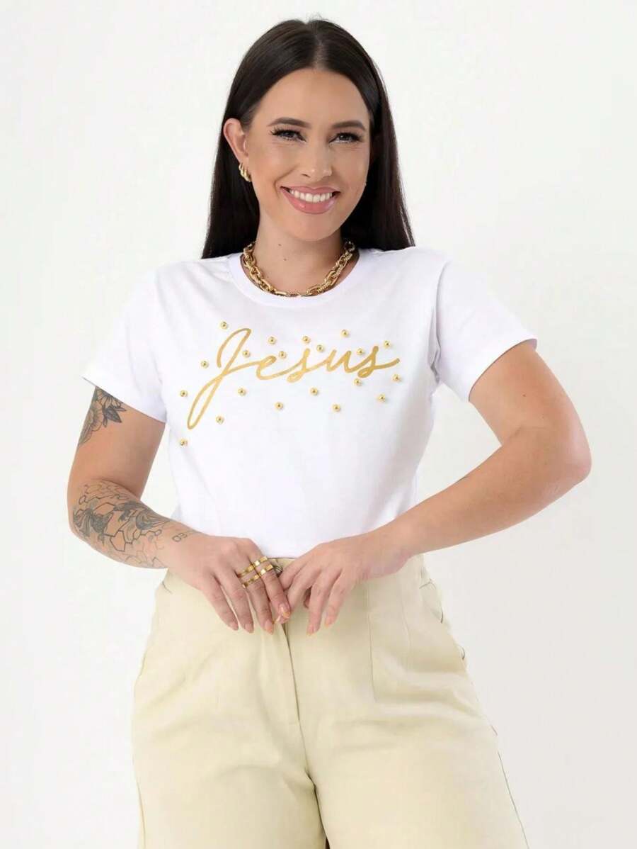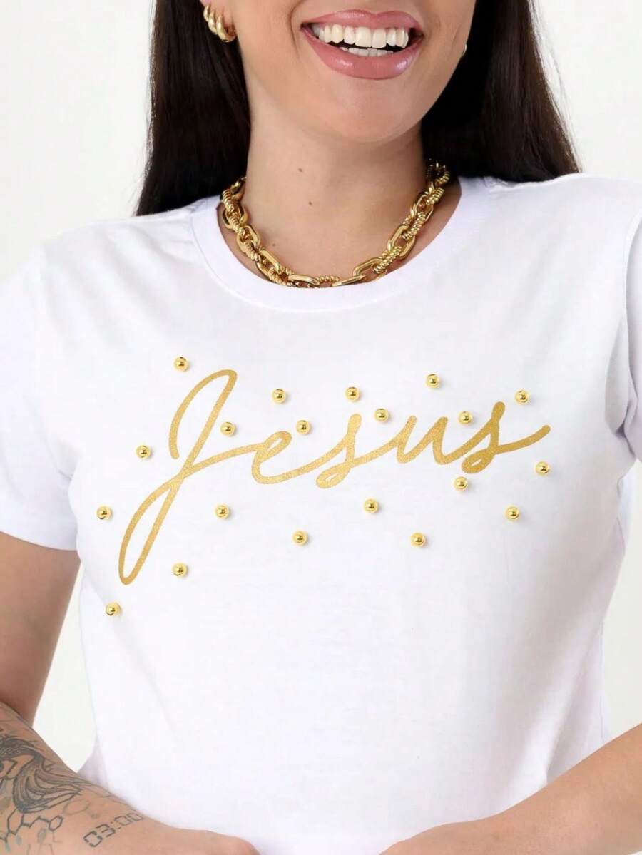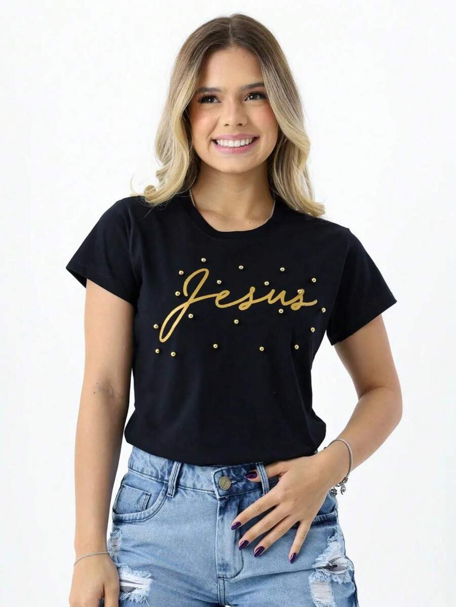 T-Shirt de Algodão Jesus com Aplicação de Pérolas