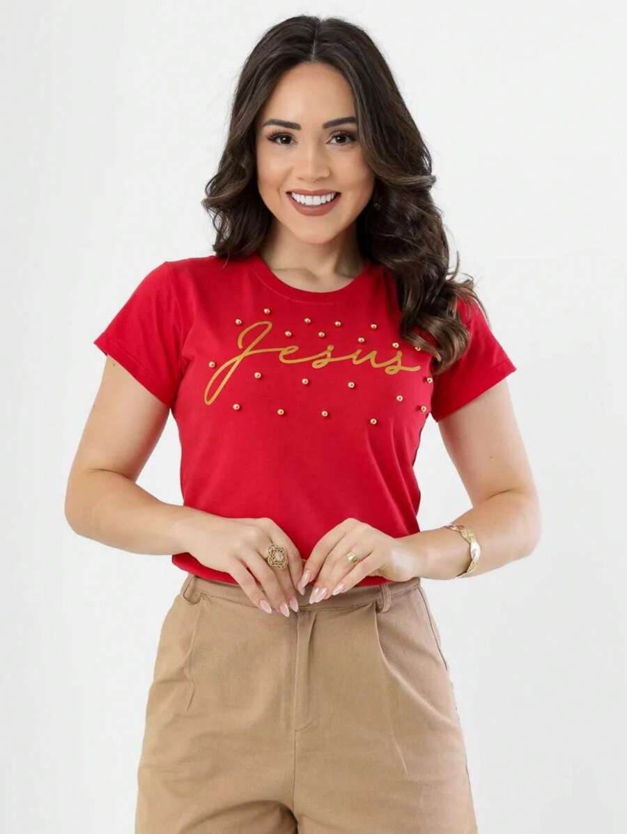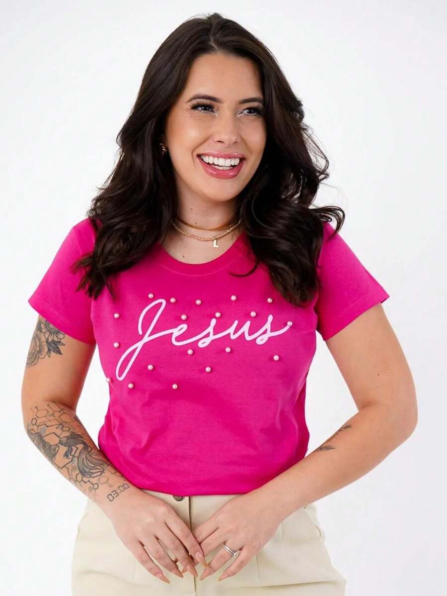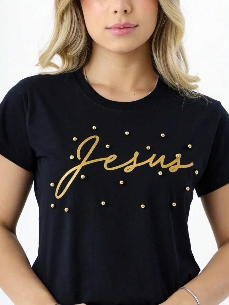T-Shirt de Algodão Jesus com Aplicação de Pérolas